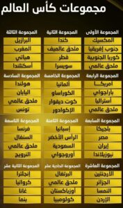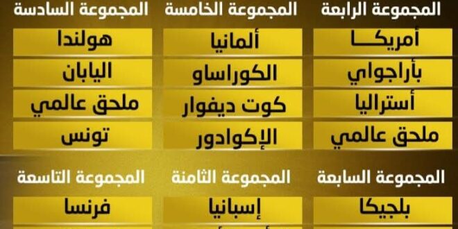 والمجموعة الخامسة ،المانيا،الإكوادور، كودفوار ،كورسوا، والمجموعة السادسة،هولندا،اليابان،تونس ،ملحق اوروبي،والمجموعة السابعة،بلجيكا،إيران، مصر،نيوزلندا.